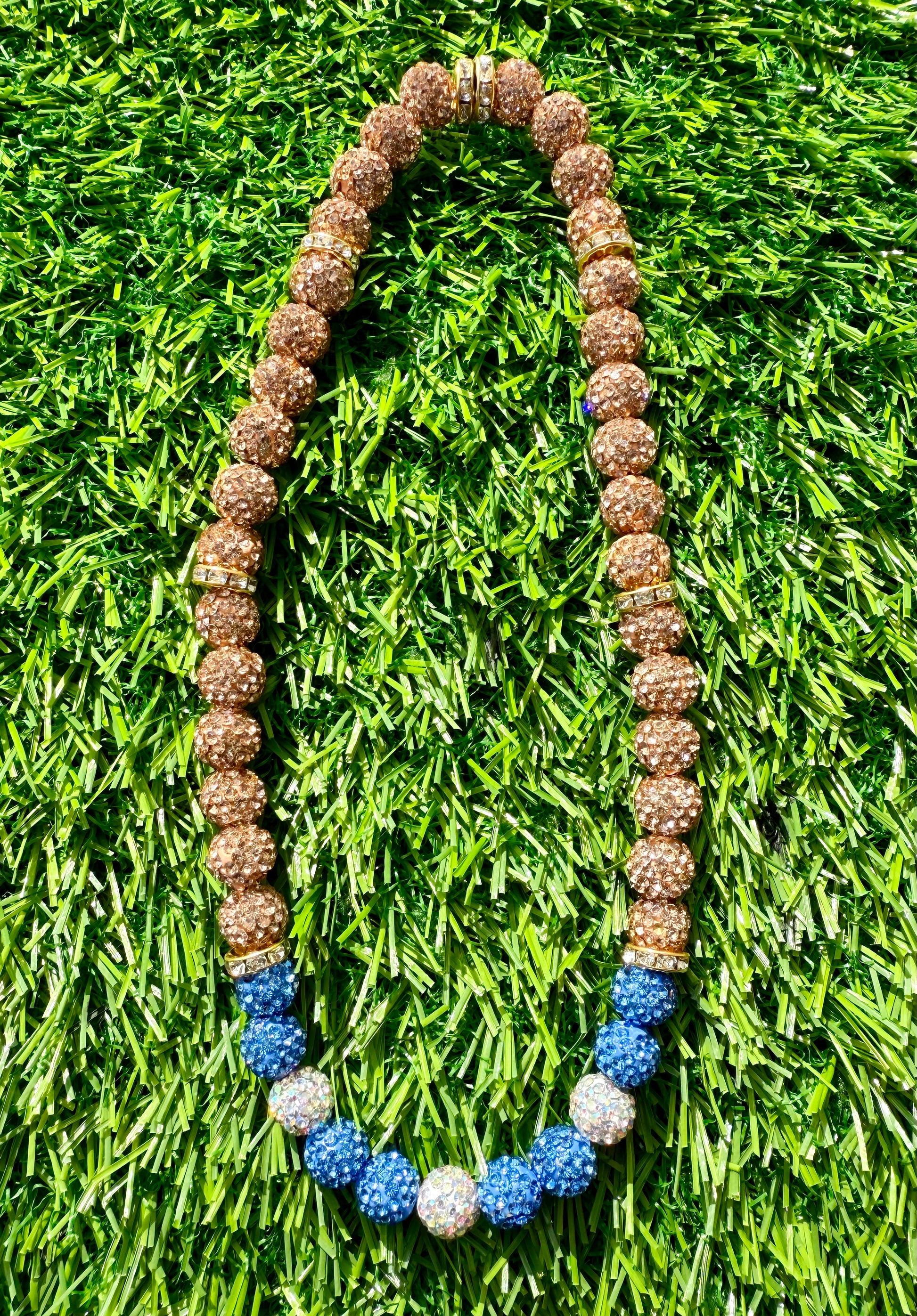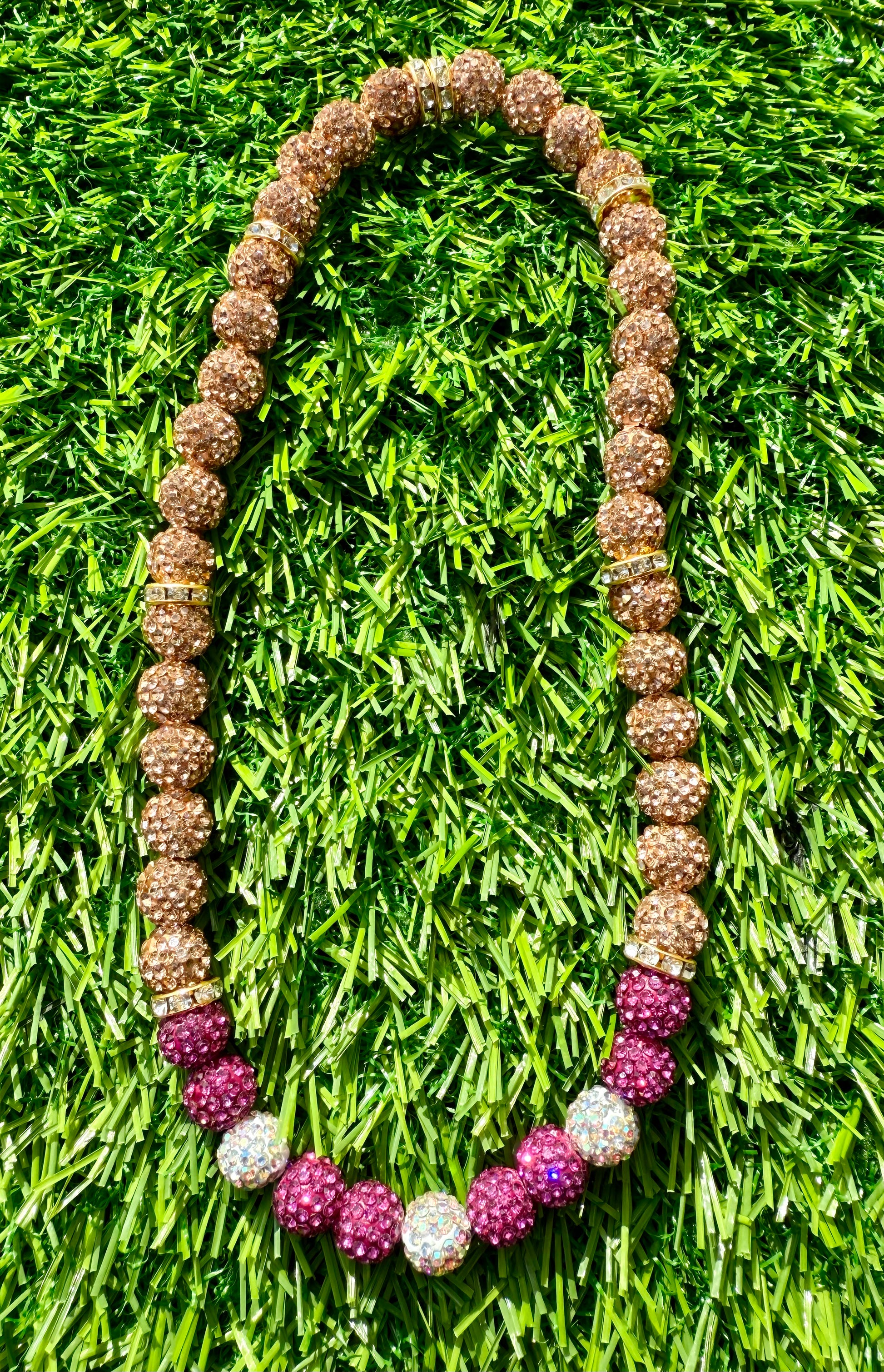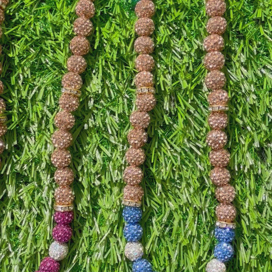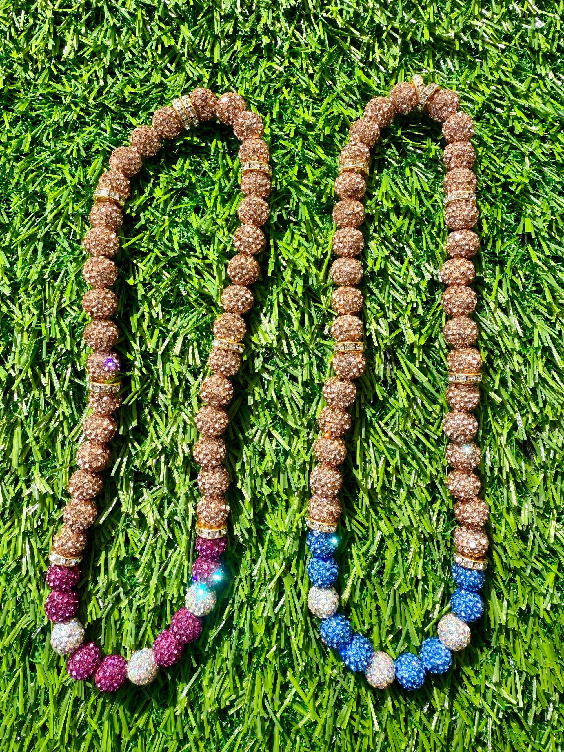 Handmade locally with choice of hot pink or light blue and gold and iridescent white clay beads and gold rhinestoned disks. Throw on and go with stretchy elastic that's up to the challenge on the field or off.