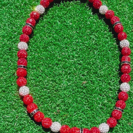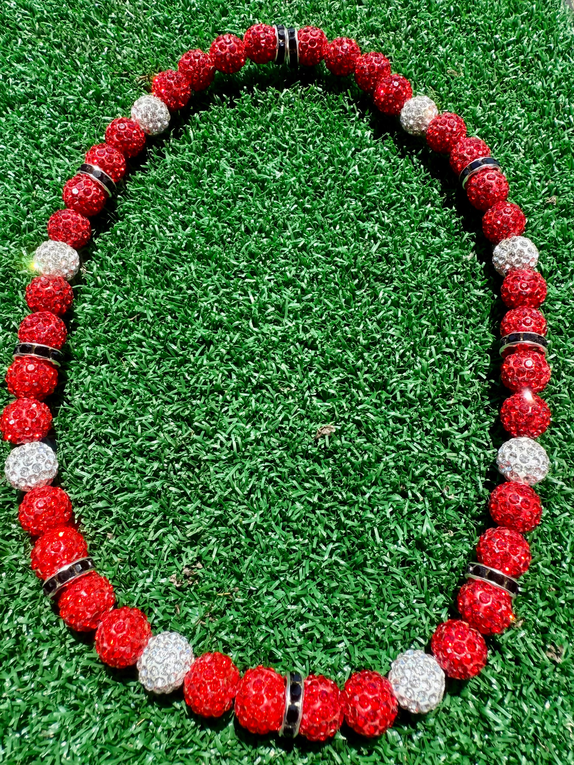 Handmade locally with red and icy white clay beads and black rhinestoned disks. Throw on and go with stretchy elastic that's up to the challenge on or off the field.